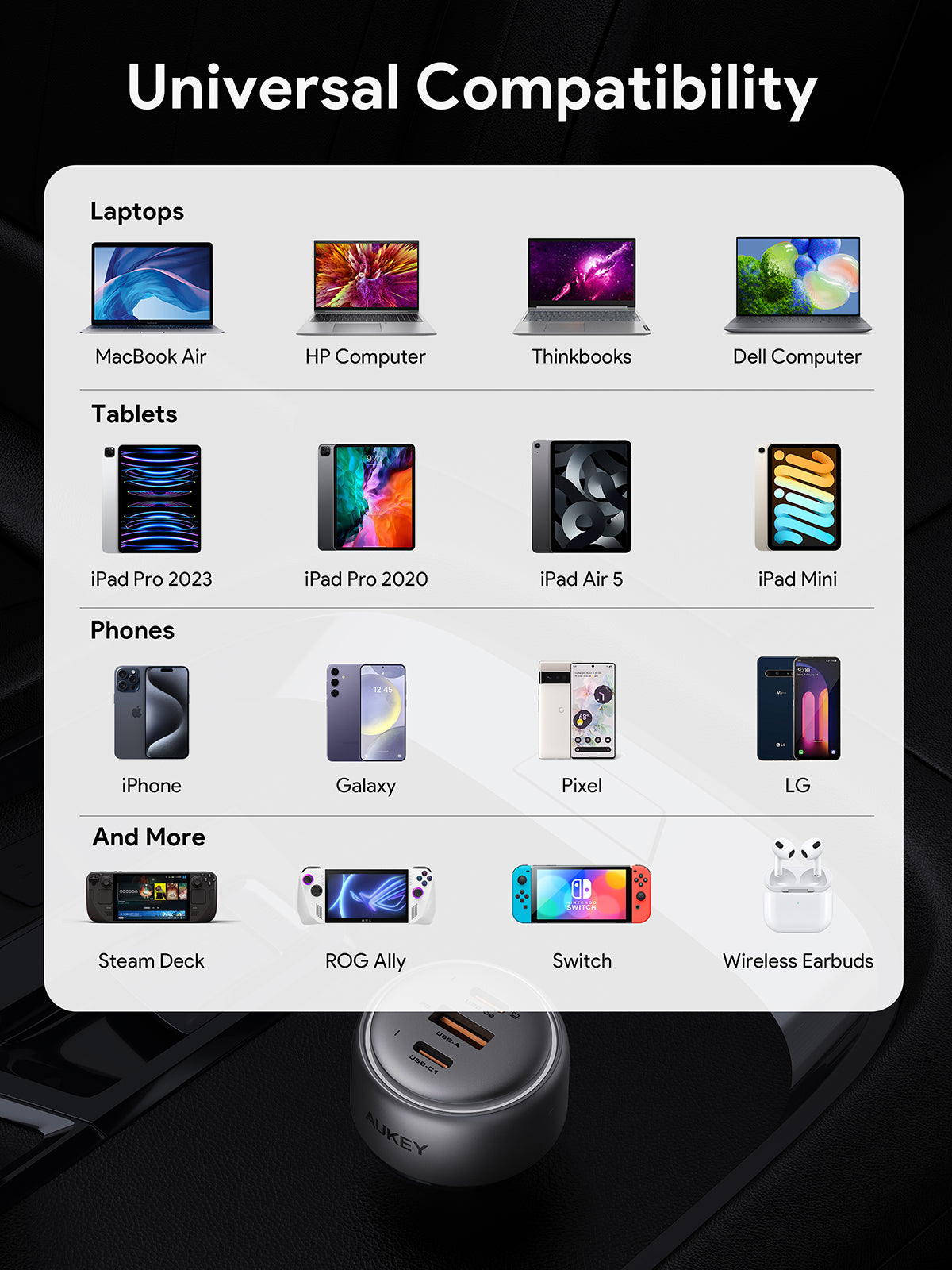 Cocok untuk standar soket 12V / 24V (pemantik rokok) dan kompatibel dengan perangkat apa pun yang diisi daya melalui USB A & USB C