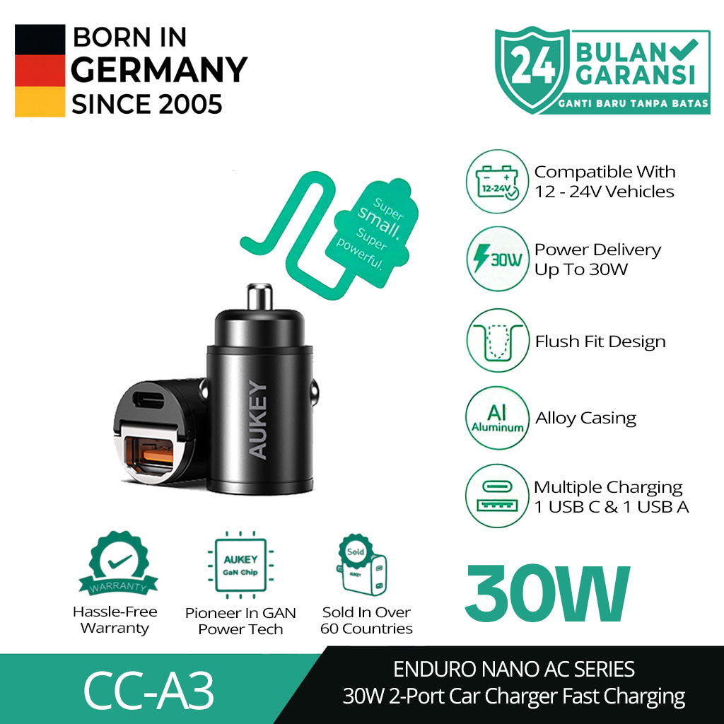 Pengisi Daya Mobil Multi Port AUKEY 30W Seri Flush Fit Expedition model CC-A3-BK USB-A dan USB-C