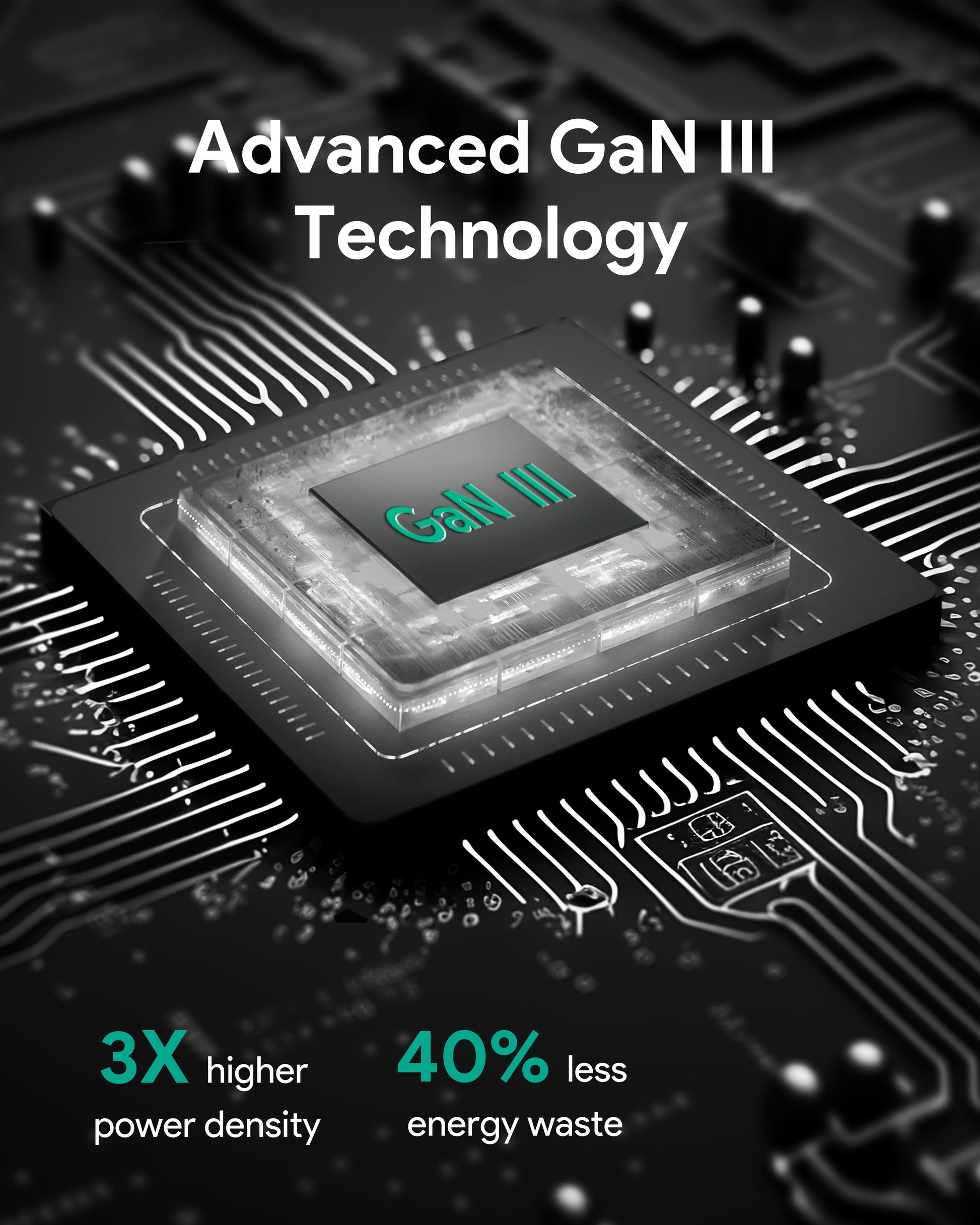 DIlengkapi dengan teknologi terbaru GAN III CHIP Teknologi yang membuat ukuran charger lebih kecil 40% dibanding charger bawaan sehingga mudah disimpan dan dibawa kemana mana