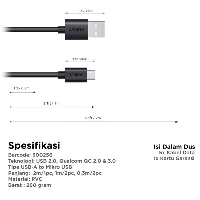 Kabel Charger AUKEY ( 5 pcs ) USB A Ke Micro PVC CB-D5 Hitam 3A