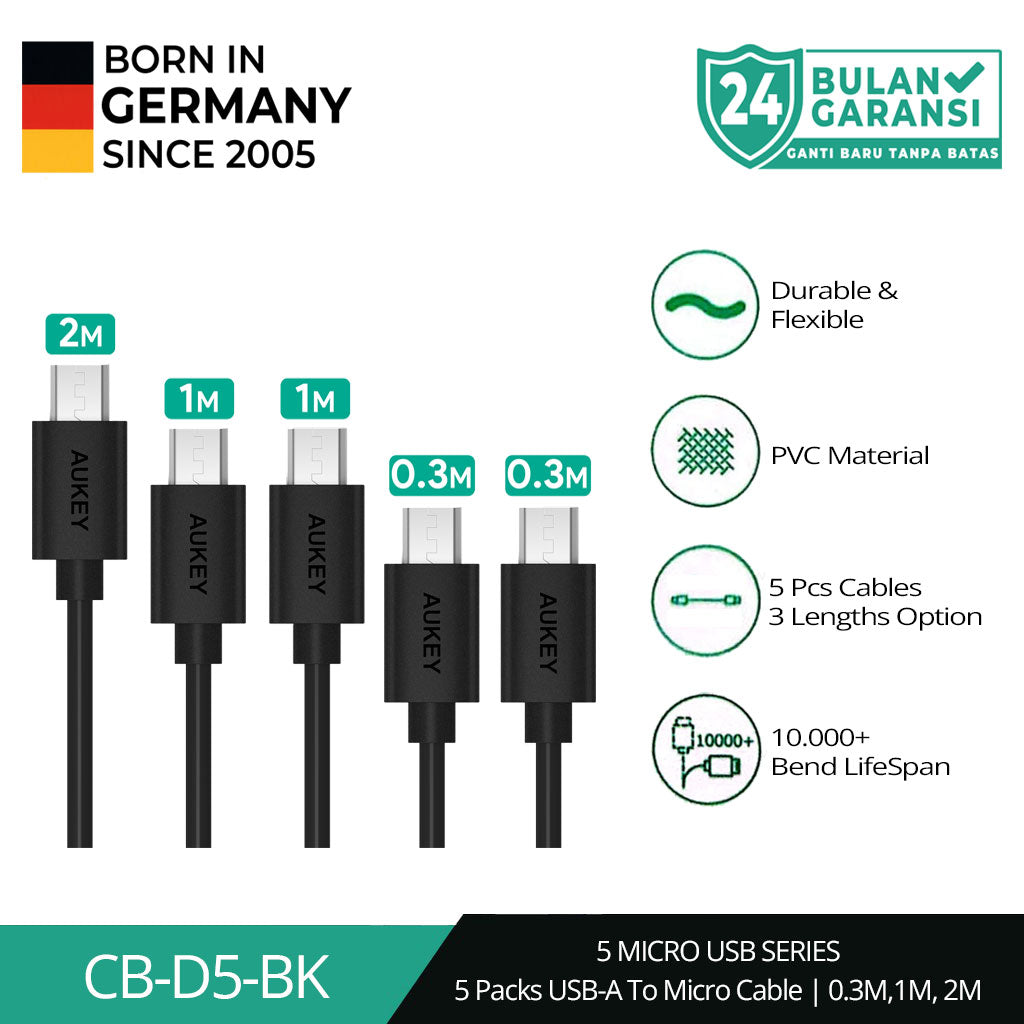 Kabel Charger AUKEY 5pcs CB-D5 Bahan PVC Hitam Kabel USB A ke Mikro