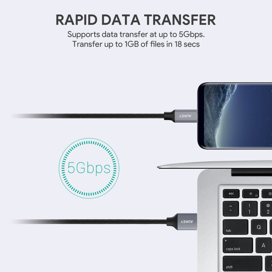 Kabel Charger AUKEY Type C CB-CD3 ( 2 Meter ) & CB-CD2 ( 1 Meter ) Kabel USB 3.0 ke USB-C Hitam Berlapis Nilon