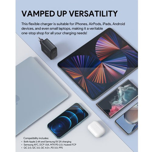 DIlengkapi dengan teknologi terkini GAN CHIP Teknologi yang membuat ukuran charger lebih kecil 40% dibanding charger bawaan sehingga mudah disimpan dan dibawa kemana mana