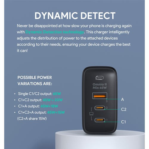 USB-C1 / C2 Output: 5V 3A=15W / 9V 3A=27W / 12V 3A=36W / 15V 3A=45W / 20V 3.25A=65W